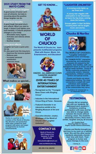 The WORLD OF CHUCKO depends on donations from folks like you who believe in the magical healing power of laughter. Your gift no matter how large or small is truly appreciated and will help us continue these original and important community programs as well as create new programming to reach more children and adult.